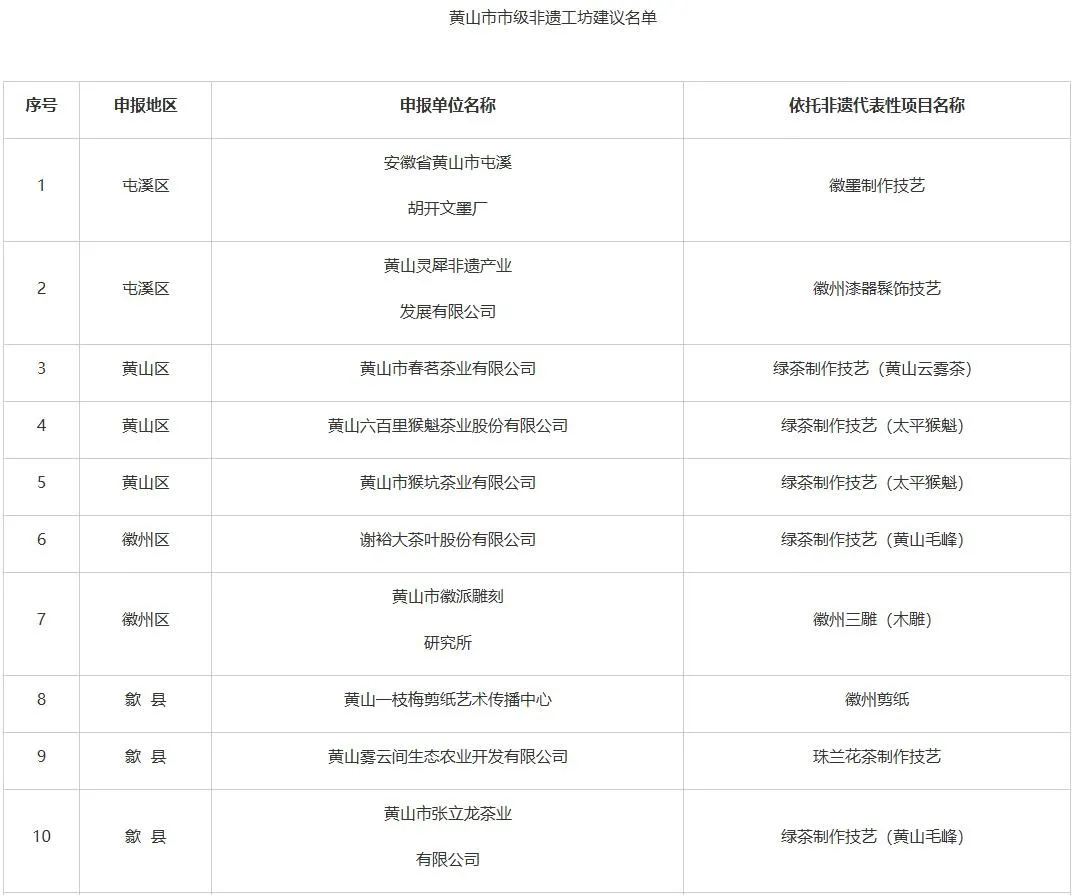 根據(jù)《安徽省文化和旅游廳安徽省人力資源和社會(huì)保障廳安徽省農(nóng)業(yè)農(nóng)村廳關(guān)于印發(fā)<安徽省非遺工坊管理辦法>的通知》要求,市文化和旅游局、市人力資源和社會(huì)保障局、市農(nóng)業(yè)農(nóng)村局聯(lián)合組織開(kāi)展了市級(jí)非遺工坊認(rèn)定工作。經(jīng)申報(bào)主體自愿申請(qǐng)、各區(qū)縣初審?fù)扑]、市級(jí)評(píng)審復(fù)核,形成市級(jí)非遺工坊建議名單,共19家,具體名單如下所示: